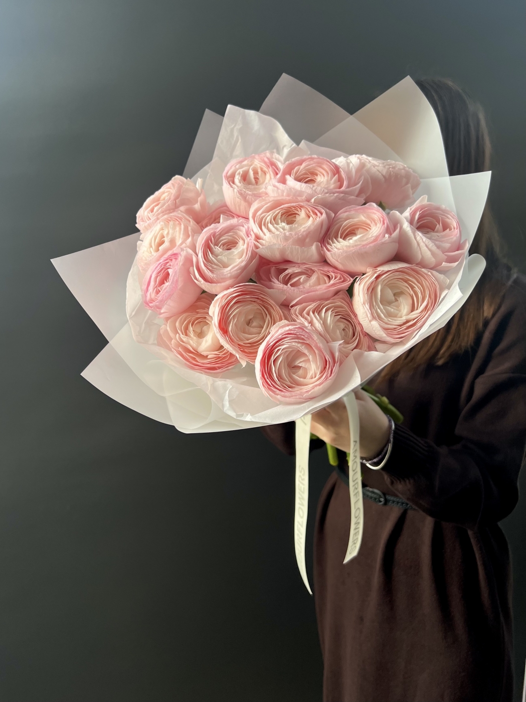 Букет диаметром 30-35 см, высота 30-35см. В составе: ранункулюсы клуни 17шт.