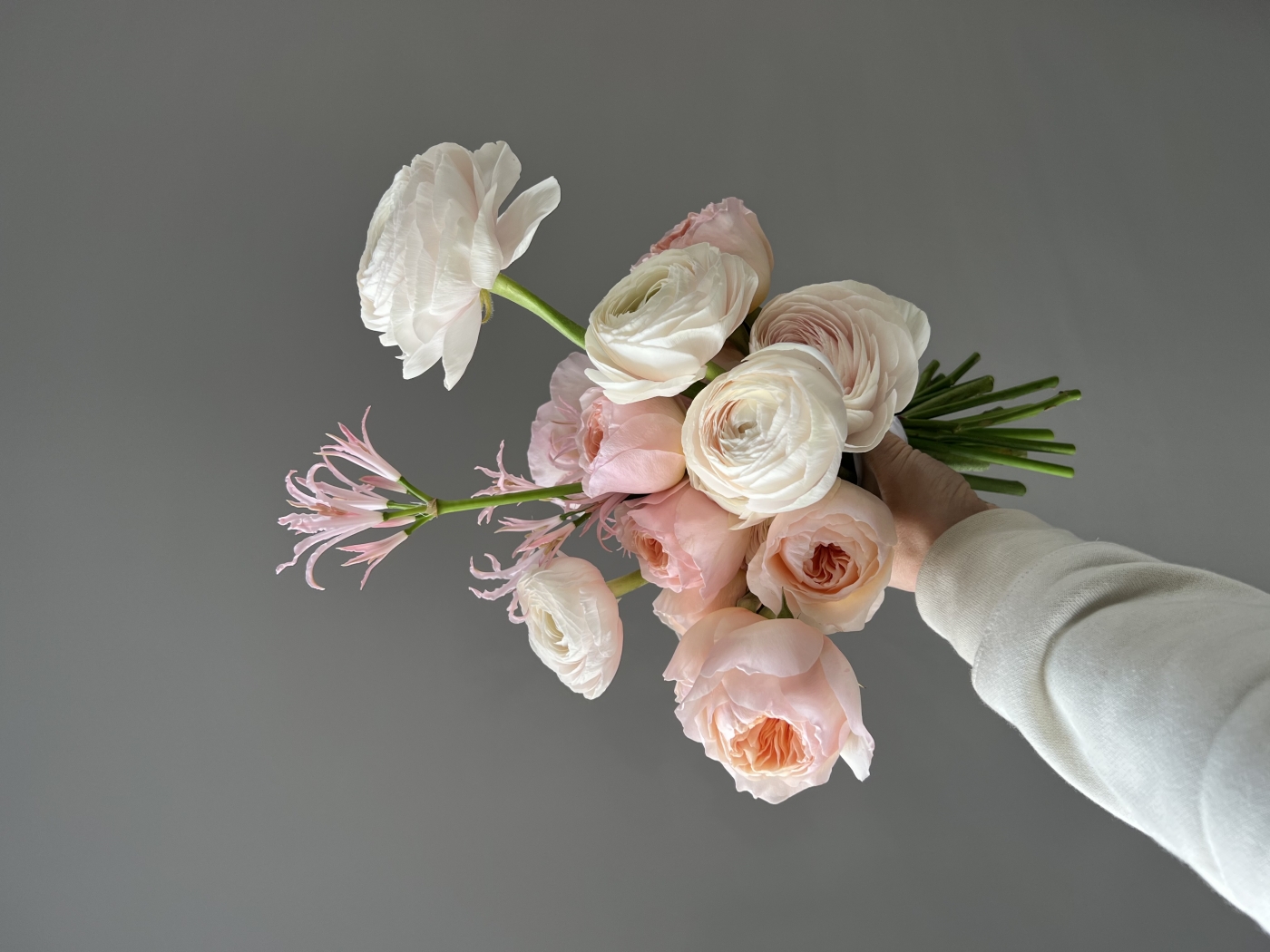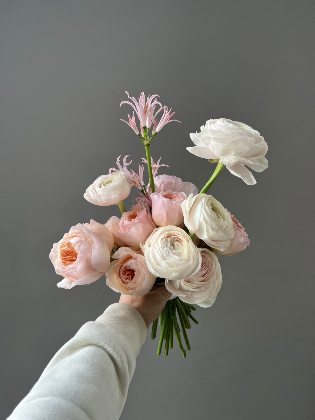 Свадебный букет из ранункулюсов, пионовидных роз, нерине. Предзаказ за 2 недели, либо обсуждаются варианты экспресс-заказа с флористом.